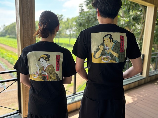 「浮世絵 meets スープカレー」 SuageオリジナルTシャツ登場! 背中には、日本伝統の人物画…かと思いきや、手にしているのはスープカレー!? 和の美とスパイスの香りが出会った、ユーモアたっぷりの一枚です。 ※男柄・女柄ともにTシャツのサイズは同じです